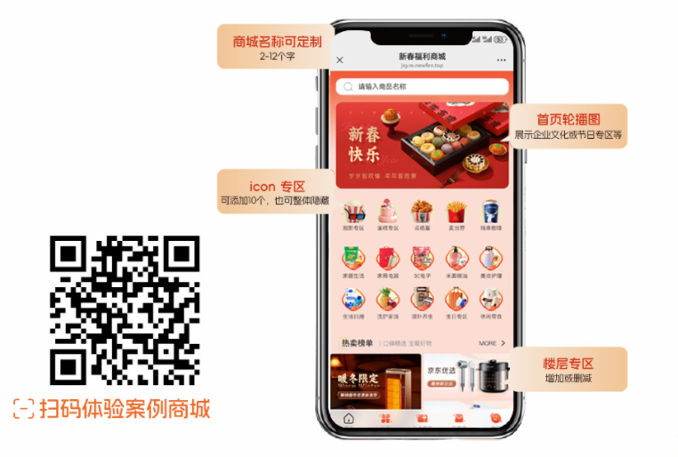 除了礼盒 LOGO、卡面设计,还能定制专属福利商城 —— 企业可自主上下架商品(比如只保留春节相关品类),设计商城皮肤(如首页轮播图展示企业年会照片、春节祝福视频),甚至定制商城名称(2-12 个字,如 “XX 公司春节福利站”);
