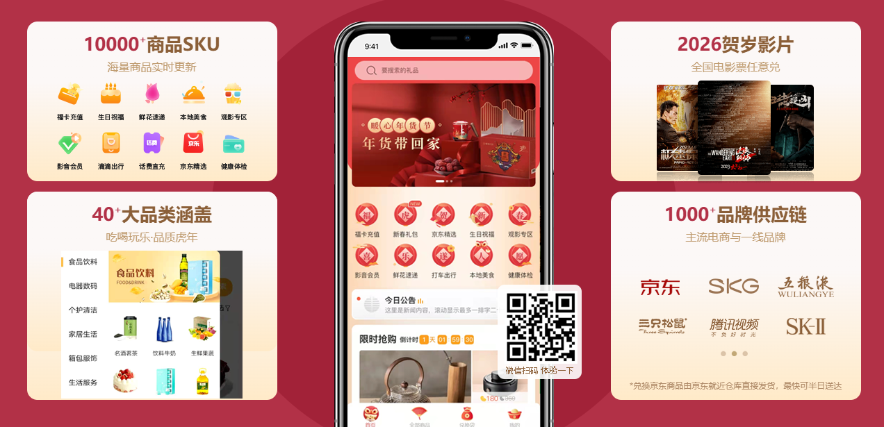 卡券可在企幸福商城兑换3000+春节好物,涵盖米面粮油、数码家电、本地生活权益(京东外卖150万+门店即时送达、16000+影院在线选座),还能兑换瑞幸、星巴克等咖啡券,满足年轻员工需求;