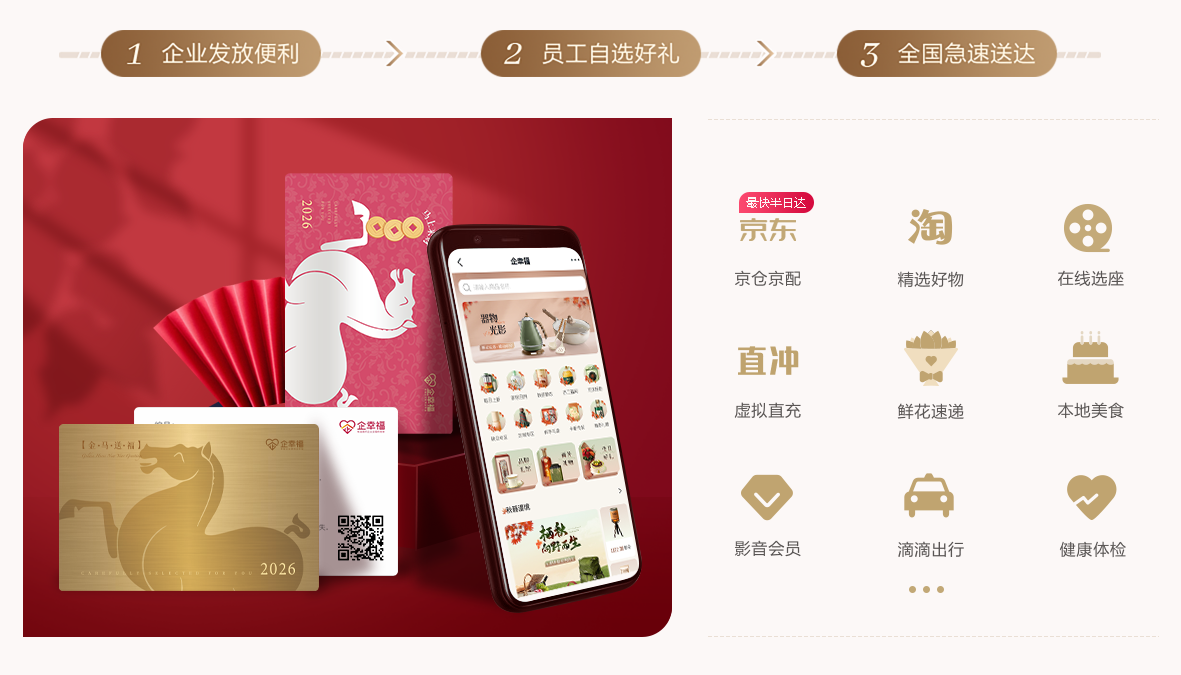 距离春节只剩3个多月,不少HR已经开始筹备员工福利:怕选的礼盒不合口味,怕发的福利不够实用,更怕批量采购流程繁琐、赶不上节前送达。其实春节福利不用愁,企幸福围绕“定制化、高适配、高效率”,推出春节专属福利方案,从礼盒到卡券,从采购到发放全流程省心,还能让员工选到心仪的礼物。