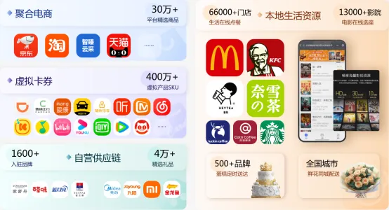 坚果零食、有机水果蔬菜礼盒、星巴克、麦当劳、肯德基等美食餐饮券;